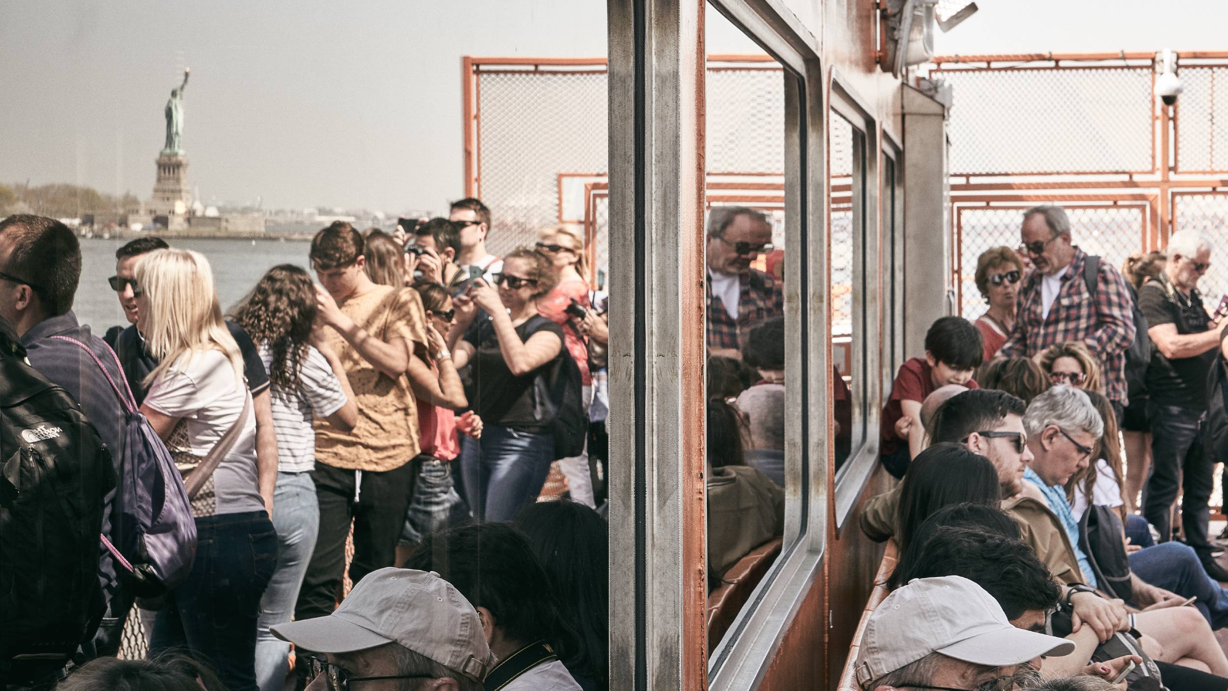 A reflection of the Statue of Liberty is just the kind of image I was hoping to find. Shot from the Staten Island Ferry, the lines of the gates align perfectly. Working together with the repeating windows to create an illusion and pull the viewer into the image.